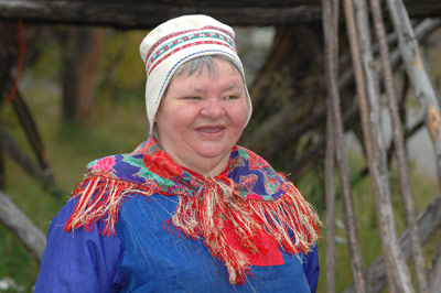 Ein sámisches Ehepaar wohnt ganzjährig auf dem Gelände. Wir treffen die Samin beim Füttern der Rentiere. Gerne stellt sie sich für ein Foto zur Verfügung.