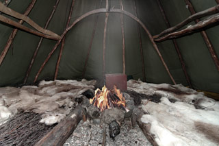 Die Sámi zogen mit ihren Rentieren von der Sommerweide (Siida) zur Winterweide. Neben festen Hütten (gamme genannt), benötigten sie transportable Behausungen, entweder in Form von lávvus (Spitzzelte) oder goahtis (mit gebogenen Birkenstämmen). In Sápmi kann man diese Unterkünfte alle sehen. Hinweistafeln geben ergänzende Infos.