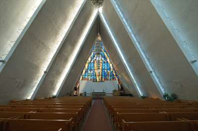 Das Kirchenschiff wirkt sachlich und schlicht. Auch im Inneren dominiert die Farbe Weiß. Kristallleuchter symbolisieren das Polarlicht. Die Kirchenbänke sind mit Kunstleder bezogen. Putzrisse und spröde werdende Sitzbezüge zeugen von der Vergänglichkeit menschlicher Werke.