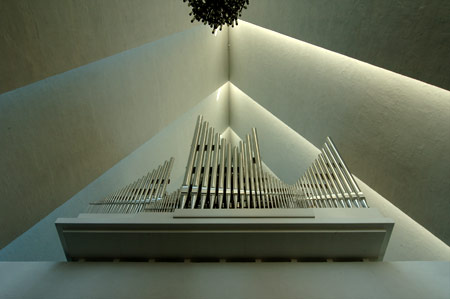 Formvollendet thront die Orgel an der Westempore. Die Anordnung der Orgelpfeifen nimmt die Dreiecksformen der Gesamtarchitektur auf. Ein stimmiges Ensemble.