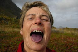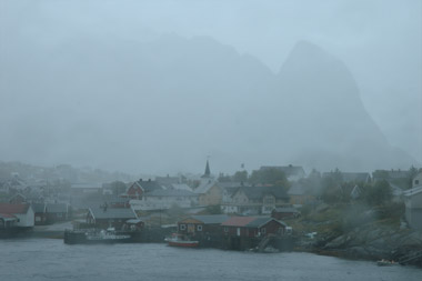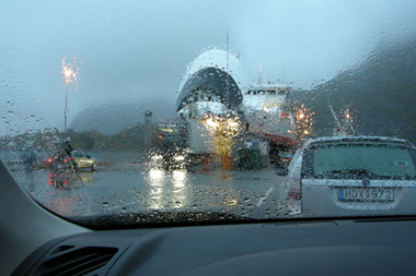 Nach einem Sonnentag zeigen sich die Lofoten wieder so, wie wir sie schon 2000 erlebt hatten: Regen ohne Unterlass! Die Wetterprognosen der kommenden Tage versprachen keine Besserung. Wir wollten deshalb von Moskenes mit der Fähre nach Bodø übersetzen. Die Überfahrt dauert drei bis vier Stunden. Allerdings kam zum Dauerregen nun auch noch Sturm aus der als "kritisch" bezeichneten südwestlichen Richtung hinzu. Die Fähre kam nicht! Was sollte man nun tun?