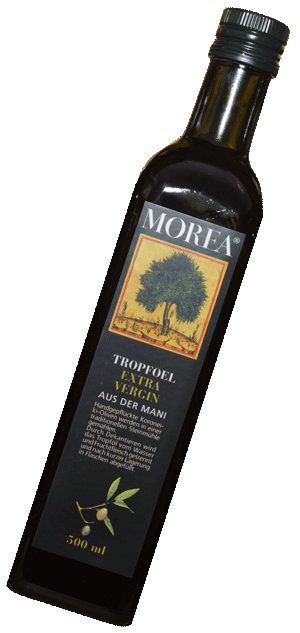 IIn der Mani, im Süden des Peloponnes, liegt das Anbaugebiet für das MOREA - Olivenöl. Auf dem steinigen, mineralreichen Boden wächst eine spezielle Olivensorte, die von November bis Februar von Hand gepflückt wird. Spätestens 4-5 Tage nach dem Pflücken werden die Oliven gepresst, um den Gehalt an freien Fettsäuren, berechnet als Ölsäure, so gering wie möglich zu halten. Das MOREA-Olivenöl hat bis 0,5 g Ölsäure je 100 g Öl, was eine Haltbarkeit von mindestens 3 Jahren ohne Geschmacksverlust gewährleistet.