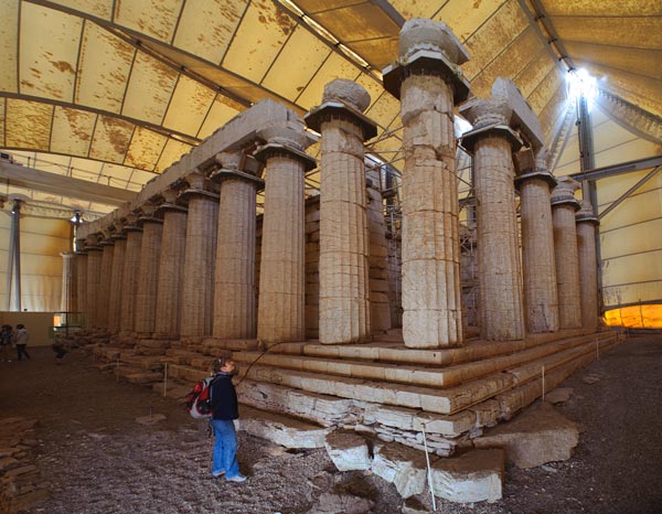 Der Apollontempel bei Bassä ist der am zweitbesten erhaltene griechische Tempel des Mutterlandes (nach dem Hephaisteion in Athen). Er war dem Heilgott Apollon Epikourios geweiht und wurde vom Erbauer der Akropolis 420 v.Chr. errichtet. Spannend ist bereits die Anfahrt über hügelige und kurvige Straßen bis auf 1150 m Höhe. Auch die Temperaturen sind hier oben deutlich kühler als an der Küste. Kein Wunder also, dass man das gute Stück à la Christo unter einem schützenden Zeltdach verpackt hat!