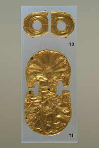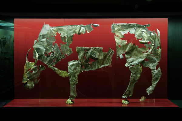Auch dieser archaische Stier aus Silberplatten war in ähnlicher Technik wie bei den chriselephantinen Skulpturen angefertigt. Er datiert auf das 7. oder 6. Jhd. v. Chr. Er beeindruckt trotz der fehlenden Elemente durch Kraft und Dynamik.