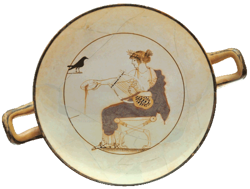 Apollon galt, im Gegensatz zum leichtlebigen Gott Dionysos, als Vertreter eines von Recht und Ordnung geprägten Weltbilds. Dichtung und Musik standen Apollon nahe. Er war der Anführer der Musen. Die Attribute des Gottes sind die Leier sowie Pfeil und Bogen. Ein dem Apollo dienender Rabe verriet ihm, dass die sterbliche Koronis, die von Apollo ein Kind erwartete, einen Sterblichen erhört hatte. Erbost über den Fehltritt schoss der Gott einen Pfeil auf die Geliebte ab. Obwohl es ihn sofort reute, konnte er sie trotz aller Bemühungen nicht am Leben erhalten. Nur der in ihrem Leib befindliche Knabe wurde gerettet. Es handelte sich um Asklepios, den der Kentaur Cheiron aufzog und in der Heilkunst unterwies. Das Gefieder des bis dahin weißen Raben färbte Apollo schwarz.