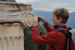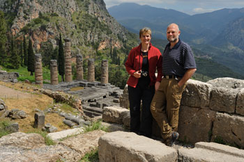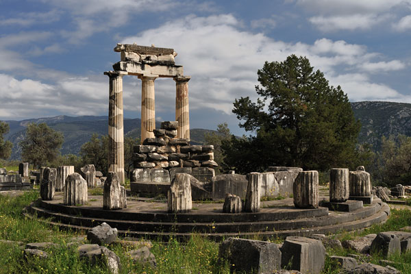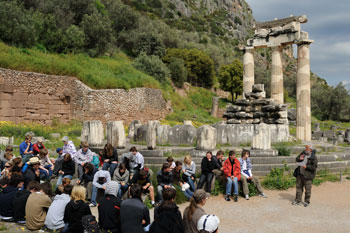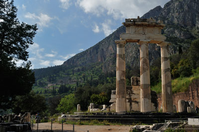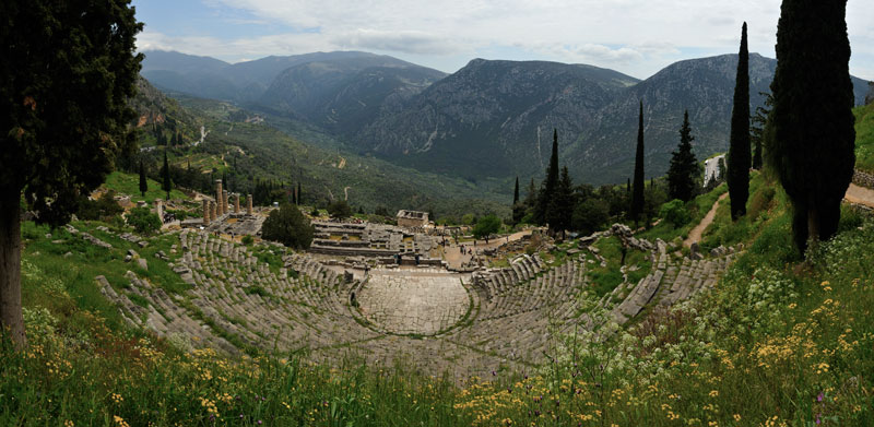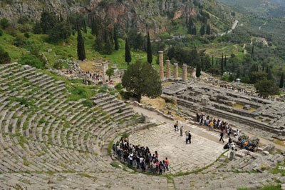Delphi galt in der Antike als Mittelpunkt der Welt und war Sitz des berühmten Orakels des Altertums. Das Ausgrabungsgelände von Delphi liegt in rund 500 Metern Höhe am Fuß des mächtigen Parnassgebirges. Es gewährt herrliche Ausblicke in das Pleistostal. Die Gebäude verteilen sich über 300 Höhenmeter in den Hang. Delphi war schon in mykenischer Zeit besiedelt (14. - 11. Jhd. v. Chr.) und als heilige Stätte der Erdgöttin Gaia geweiht. Seinen Namen leitet Delphi vom griechischen Wort „delphos“ (Gebärmutter) ab.