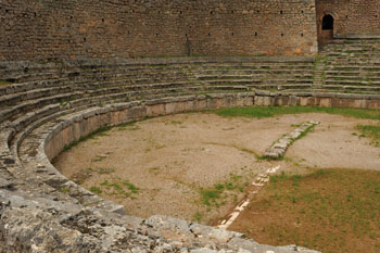 Durch die ganze Tempelanlage windet sich die heilige Straße. Oberhalb des Apollontempels, am Fuß des Parnassgebirges, liegt das antike Amphitheater. In dem Bau aus dem 3. oder 4. Jhd. v. Chr. war Platz für ca. 5000 Zuschauer. Es ist trotz der zahlreichen Erdbeben noch sehr gut erhalten. Im Theater fand der musische Teil der panhellenischen pythischen Spiele statt. Es wurden Hymnen an Apoll vorgetragen und Schauspiele aufgeführt. Die sportlichen Wettkämpfe wurden im weiter oberhalb gelegenen Stadion ausgetragen.