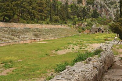 Das Stadion von Delphi ist ca. 180 m lang und wurde teilweise aus dem Berghang herausgebrochen. Es bot Platz für ca. 7000 Zuschauer. Die Aschenbahn wurde von 20 Sitzreihen flankiert. Hier fanden im vierjährigen Turnus die Athletenwettkämpfe (Fünfkampf, Ring- und Faustkampf) und Pferderennen der panhellenischen pythischen Spiele statt.