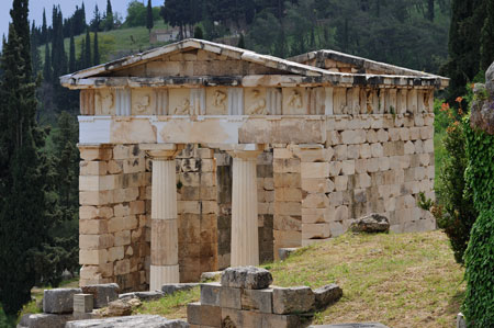 Die Heilige Straße, die zum Tempelheiligtum des Apollon führte, wurde von 28 Schatzhäusern der griechischen (Stadt)Staaten gesäumt. Die Schatzhäuser erfüllten repräsentative Zwecke und dienten zur Aufbewahrung der Weihgeschenke. Das heute rekonstruierte Schatzhaus der Athener wurde in der Zeit zwischen 510 und 490 v. Chr. in der Form eines Antentempels im dorischen Baustil erbaut.