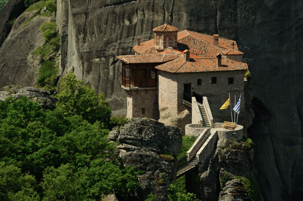 Das kleine Roussanou-Kloster wurde im 13. oder 14. Jahrhundert gegründet. Da es an der auffälligsten Stelle mitten in der Meteora-Region liegt, war es trotz seiner Höhenlage ständig Ziel und Opfer von Überfällen und Plünderungen. Im Jahre 1940 wurde es aufgegeben, aber bereits in der 50er Jahren wurde es wieder genutzt. Heute ist es ein Frauenkloster und kann besichtigt werden. Viel zu sehen gibt es im Kloster zwar nicht, aber die Aussicht ist atemberaubend.