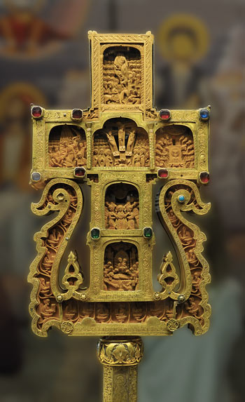 Religiöse Motive filigran in Holz und Gold gearbeitet