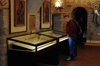 Im größten der Meteoraklöster werden zahlreiche religiöse Objekte ausgestellt. Wir können uns an der Holzschnitzkunst und den Ikonen gar nicht satt sehen. Doch leider ist das Fotografieren nicht gestattet. Ich (Uwe) kann es trotzdem nicht lassen. Ich fotografiere mit dem nötigen Respekt, dezent und ohne Blitz.