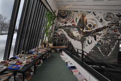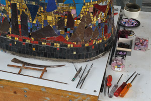 Regine Juhls arbeitet bereits seit 13 Jahren an einem außergewöhnlichen Wandmosaik. Bunte Keramikscherben kombiniert sie mit rauem Schieferstein. Golden glänzende Steinchen werden mit rostfarbenem Eisen und leuchtendem Türkis zu fantasievollen Formen zusammengesetzt.