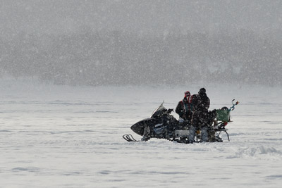 Die Eisangler kommen mit Schneemobilen an die Eislöcher