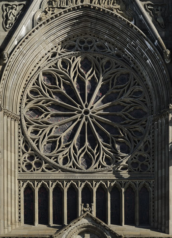 Mächtige Rosette nach gotischem Vorbild an der Westfassade