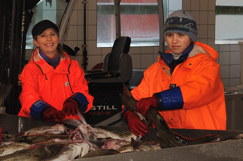 Auch diese Damen lassen sich trotz Kälte die gute Laune nicht nehmen. Sie binden die ausgenommenen Fische an den Schwänzen zusammen, damit sie paarweise an den Trockengestellen aufgehängt werden können.