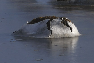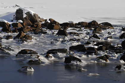 Ebbe und Flut sind verantwortlich für diese kuriosen Eisgebilde. Friert die See in Küstennähe bei Flut zu, führt der sinkende Wasserspiegel bei Ebbe dazu, dass die Eiskruste von den darunter liegenden Steinen aufgebrochen wird.