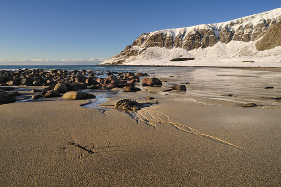 Die Küstenlandschaften der Lofoten sind sehr abwechslungsreich. Raue, schroffe Felsklippen gibt es ebenso wie rund gewaschene Kiesstrände oder karibisch anmutende Sandstrände. Wenn sich im Winter noch Eis oder Schnee dazugesellen, ergeben sich Bilder, die nicht ganz alltäglich erscheinen.