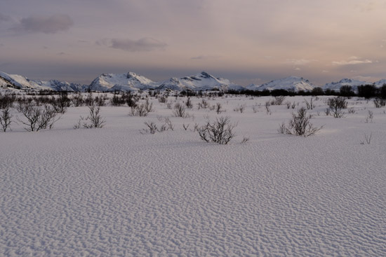 Wir können uns am Anblick der Schneestrukturen gar nicht satt sehen. Im Sommer wird aus der endlosen Schneewüste im Naturreservat auf Gimsøya vermutlich eine üppige Sumpflandschaft und Brutstätte für Vögel und Moskitos.