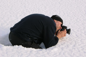 Die nächste Frage, die sich uns stellte, betraf Uwe's liebstes fotografisches Ausrüstungsteil: das Stativ. Wie präpariert man ein Stativ, damit es nicht im Tiefschnee versinkt? Unsere Lösung: wir befestigen herkömmliche Teller von Skistöcken daran! Hat auch ganz gut funktioniert.
