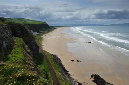Vom Strand bei Benone hat man einen herrlichen Blick zur Steilküste mit Wasserfall und Mussenden Temple. Besonders ambitionierte Autofahrer können bei Ebbe am 11 km langen Downhill Beach entlangfahren. Ein Fahrerlebnis, welches wir bisher nur von Australien kannten!