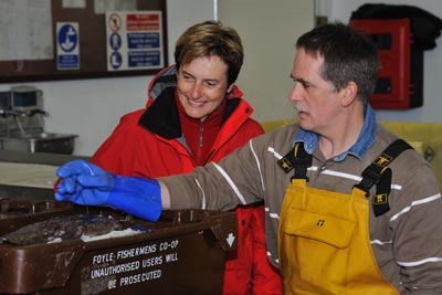 Der Zufall wollte es, dass wir in einer der Fischhallen am Hafen auf Brian McDermott, Irlands ersten Community Chef, stoßen. Er wird gerade von einem deutschen Filmteam interviewt. Seine Aufgabe als Community Chef ist die Unterrichtung der Bevölkerung über gesundes Kochen mit regionalen Produkten. Er hat eine eigene Internetadresse, hält Kurse und unterrichtet Schulklasen. Zuvor kochte er 17 Jahre als Profikoch. Seine Begeisterung für frische Lebensmittel und insbesondere frischen Fisch ist ihm anzumerken! Er liebt und lebt das Kochen!