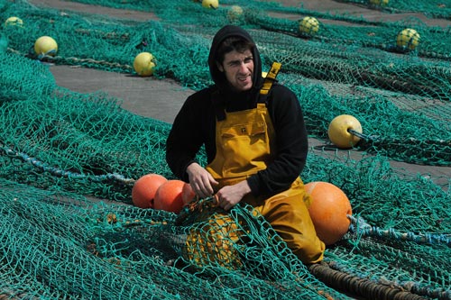 Die Seeleute breiten die Netze aus und überprüfen sie auf Beschädigungen. Unter munterem Plaudern flicken Ian und seine Kumpel die Löcher. Dass wir sie bei der Arbeit beobachten und fotografieren, stört sie nich. Im Gegenteil! Wir erfahren, dass sie eine Woche bei schlechtem Wetter auf dem Fischkutter auf See waren. Nun haben sie eine Freischicht, dann geht es wieder raus. "Seefest" muss man schon sein, bei diesem Job!