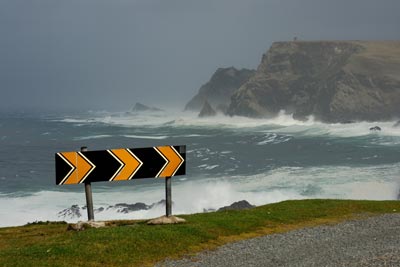 Wir sind einmal mehr in wunderschöner Landschaft, herrlichen Steilklippen und tollen Sandstränden unterwegs. Doch der Sturm peitscht die Wellen weit über das Land. Selbst die Schafe verlieren die Lust, bei diesem Wetter zu grasen und flüchten ins Landesinnere. Zum Slieve Leage zu fahren, das wäre viel zu gefährlich. Schon jetzt zerrt der Sturm am Auto. Aussteigen wird zum Abenteuer.