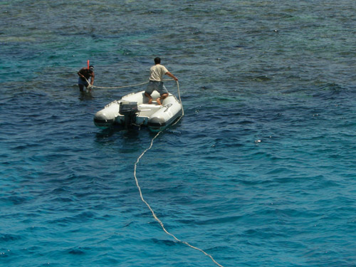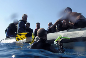 Uwe beobachtet, wie Moni ins Zodiac gehievt wird. Ist eine ganz schöne "Action", bis alle wieder eingesammelt sind.
