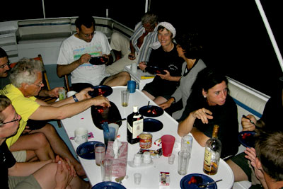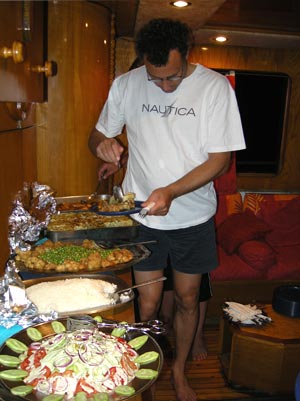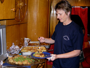 Dank der ruhigen See kann auch Moni am Büffet kräftig zulangen.