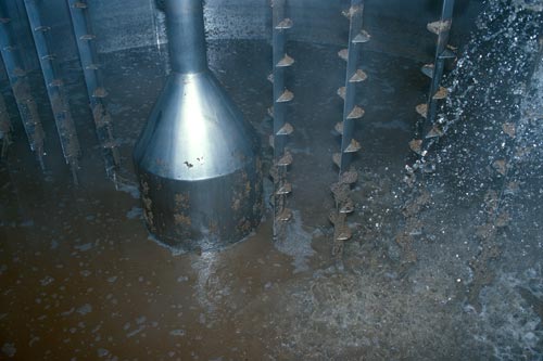 Das getrocknete, geschrotete Gerstenmalz wird nun mit heißem Wasser zu Maische verrührt.